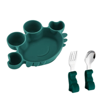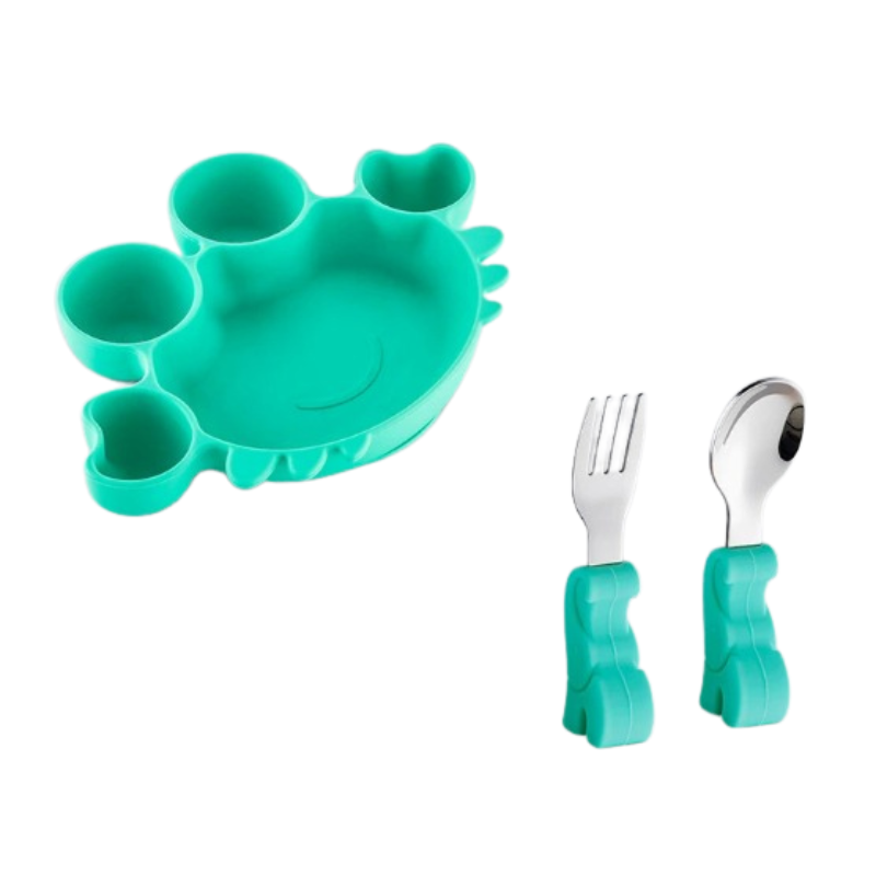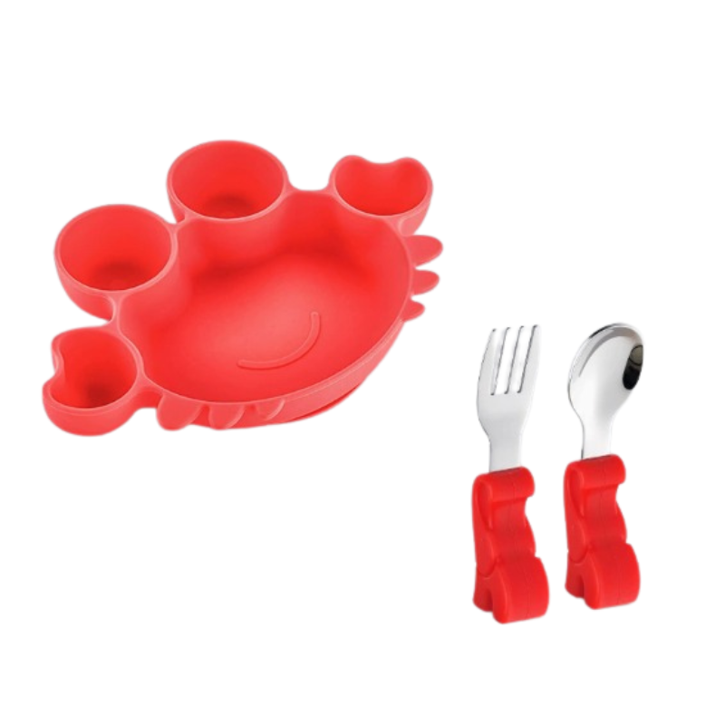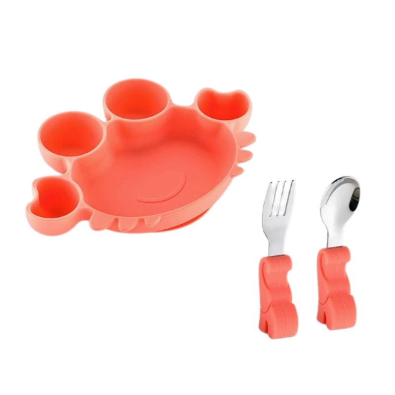 Ett praktiskt matset för baby som gör måltiden lugnare och enklare. Skålen står stadigt på bordet tack vare sugfunktionen, vilket minskar spill och vältande under matstunden. Den lekfulla krabbdesignen gör måltiden roligare för barnet.