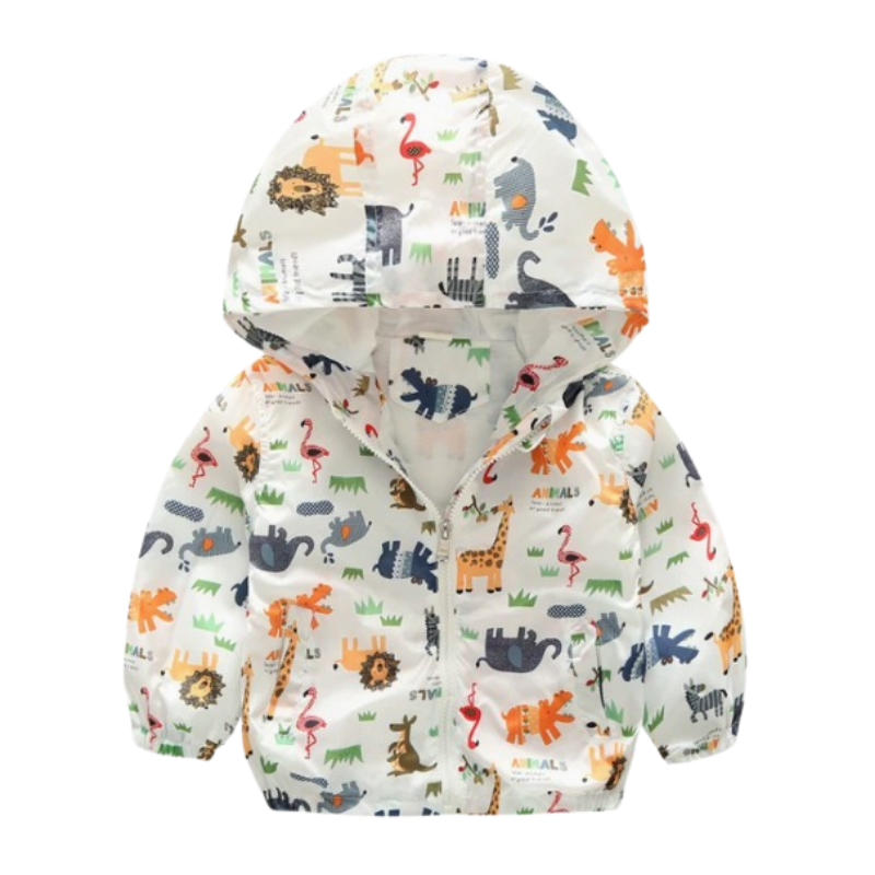 En bekväm och lekfull jacka för barn som passar perfekt för vår och höst. Jackan har huva och dragkedja framtill, vilket gör den enkel att ta på och av. Det barnvänliga trycket ger ett glatt uttryck som uppskattas i vardagen.