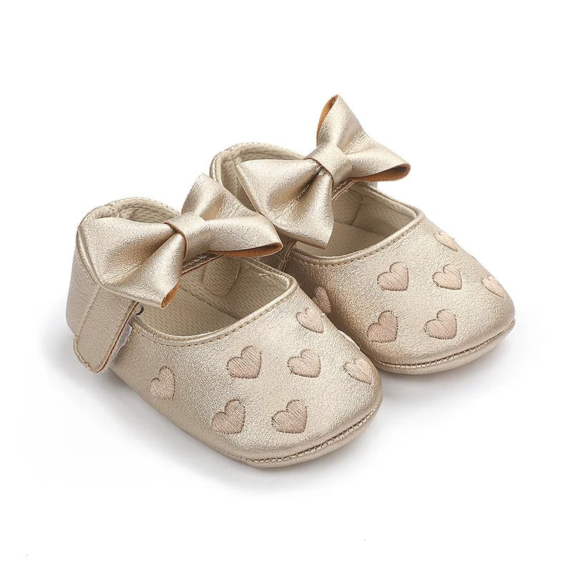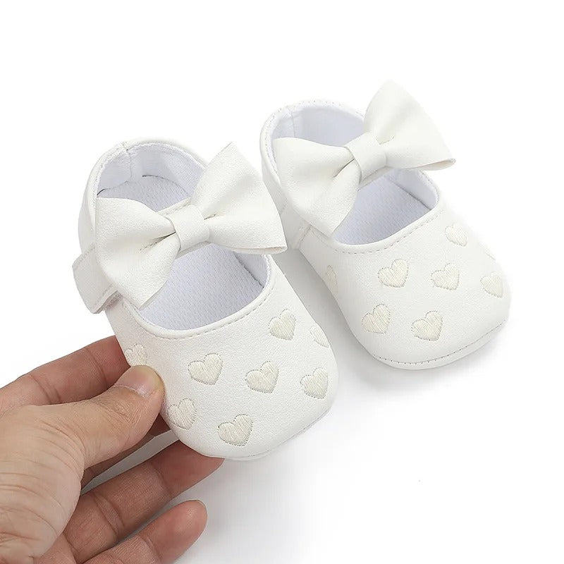 Söta och bekväma skor för barnets första steg, med fin rosett och hjärtdetalj som ger ett klassiskt uttryck. Skorna sitter mjukt runt foten och ger stabilitet när barnet börjar resa sig och gå. Formen är anpassad för små fötter och ger trygg rörelse.