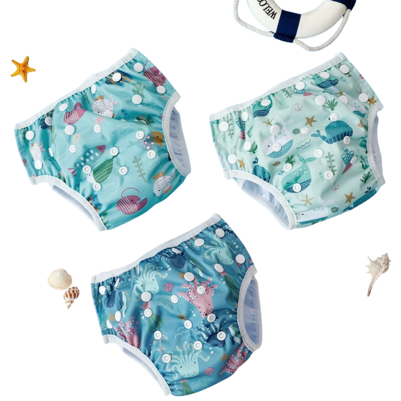 Ett praktiskt 3-pack badblöjor för baby, anpassade för lek och bad i pool och hav. De sitter bekvämt runt midja och är utformade för att fungera säkert i vatten. Passformen kan justeras för att följa barnets storlek.