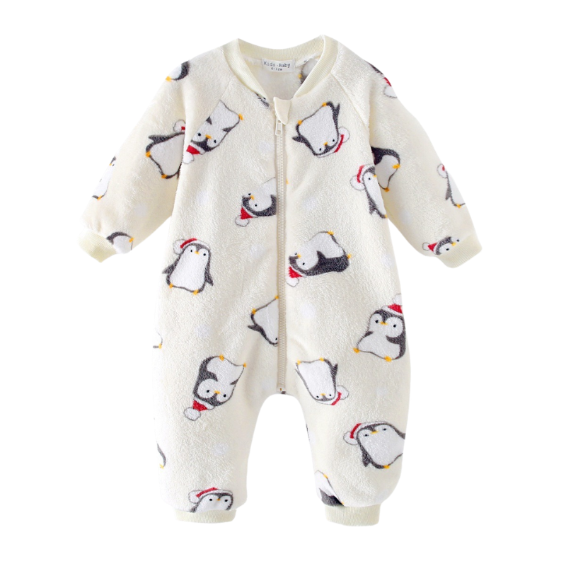 En mysig och varm overall för baby med söt pingvindesign. Den omslutande modellen håller barnet ombonat under kyligare dagar och ger en trygg känsla vid både vila och utflykt.